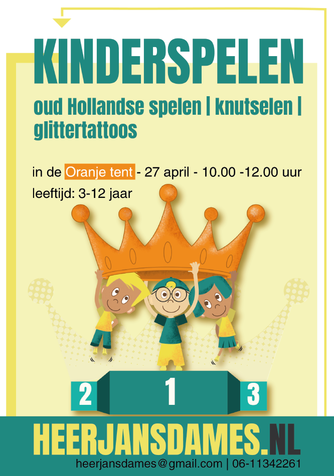 Kinderen uit Heerjansdam weten vast wel waar zij willen zijn op 26 april! Op koningsdag wordt de groenstrook omgetoverd tot een heuse vrijmarkt voor kinderen. Deelname is gratis en je mag speelgoed, spelletjes, boeken, CD’s, kleding, sportartikelen proberen te verkopen of te ruilen. Zo kunnen de kinderen spelenderwijs het ondernemerschap leren. De organisatie raadt aan iets mee te nemen om op de grond te leggen, iets om op te zitten en natuurlijk een veilig geldkistje.